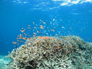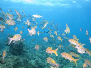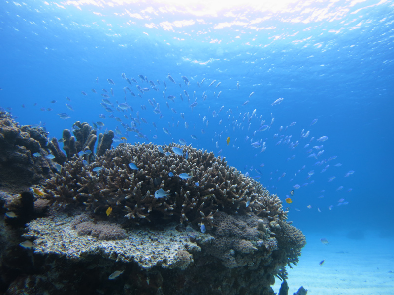 他には、仲良しペアのロクセンヤッコや、ノコギリダイ&アカヒメジの群れ群れ