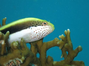 幼魚にだけ見られる、蛍光ブルーが特徴的なアマミスズメダイ。