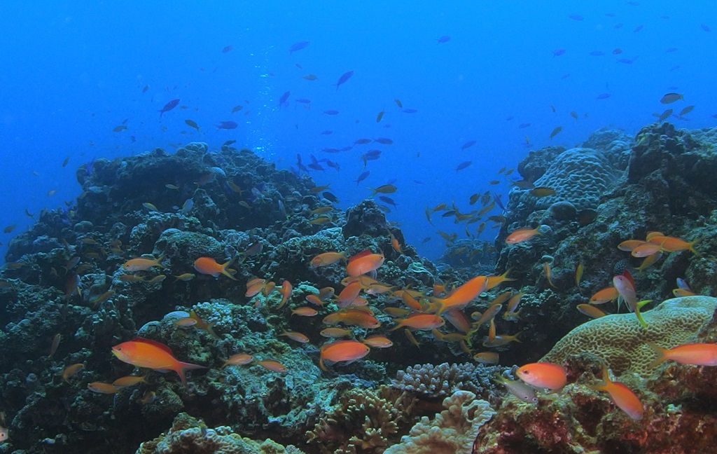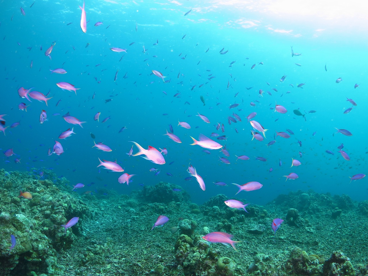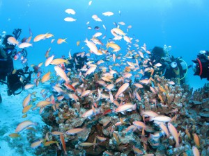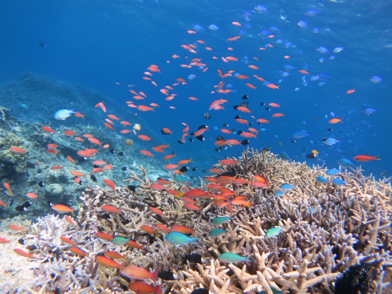 カラフルなサンゴの周りには「アカネハナゴイ」が乱舞