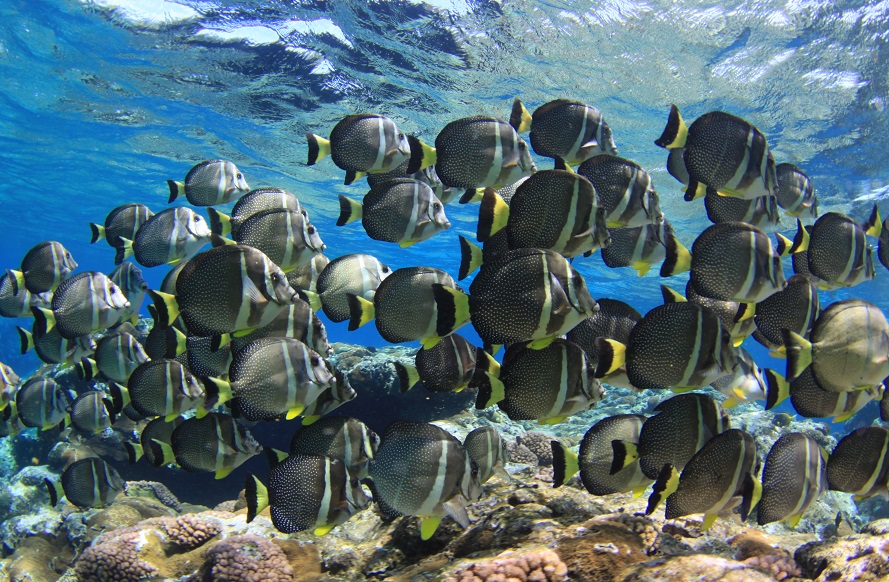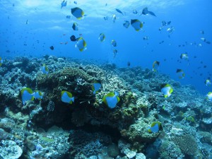 浅瀬に上がると、アカククリやヒョウ柄のチョウチョウコショウダイ