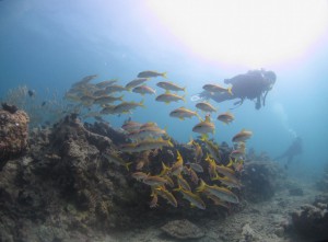 網取浅場のハナダイの根には、相変わらず多くのハナダイが集まっていますが、さらにこの根にグルクンの稚魚がつきはじめました。これをから揚げにすると美味しいんだわ!っじゃなくて・・・、より一層この根を賑わせてくれています。動きが機敏なので、遊びがいがあります。