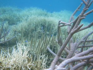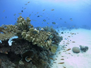 浅いサンゴの周りには、ヘコアユ20匹位の団体もいて