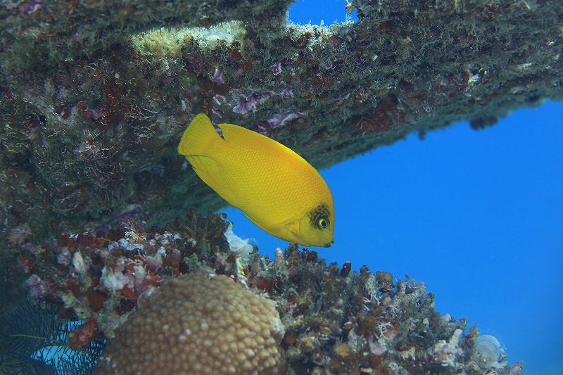 浅瀬には、黄色の体で目の上にアザのような模様がある、ヘラルドコガネヤッコひらめき