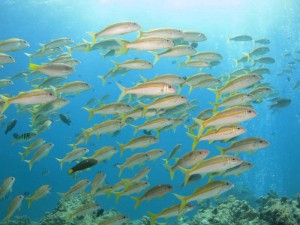 他にもノコギリダイの群れや、タイガースカラーのヒレナガスズメダイの幼魚を