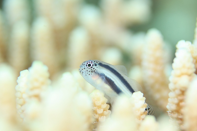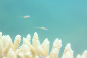 サンゴが折れてしまうと、その周りに住んでいた魚も少し減ってしまいますが、 生き残っているサンゴには、可愛いお魚が沢山いましたよ~