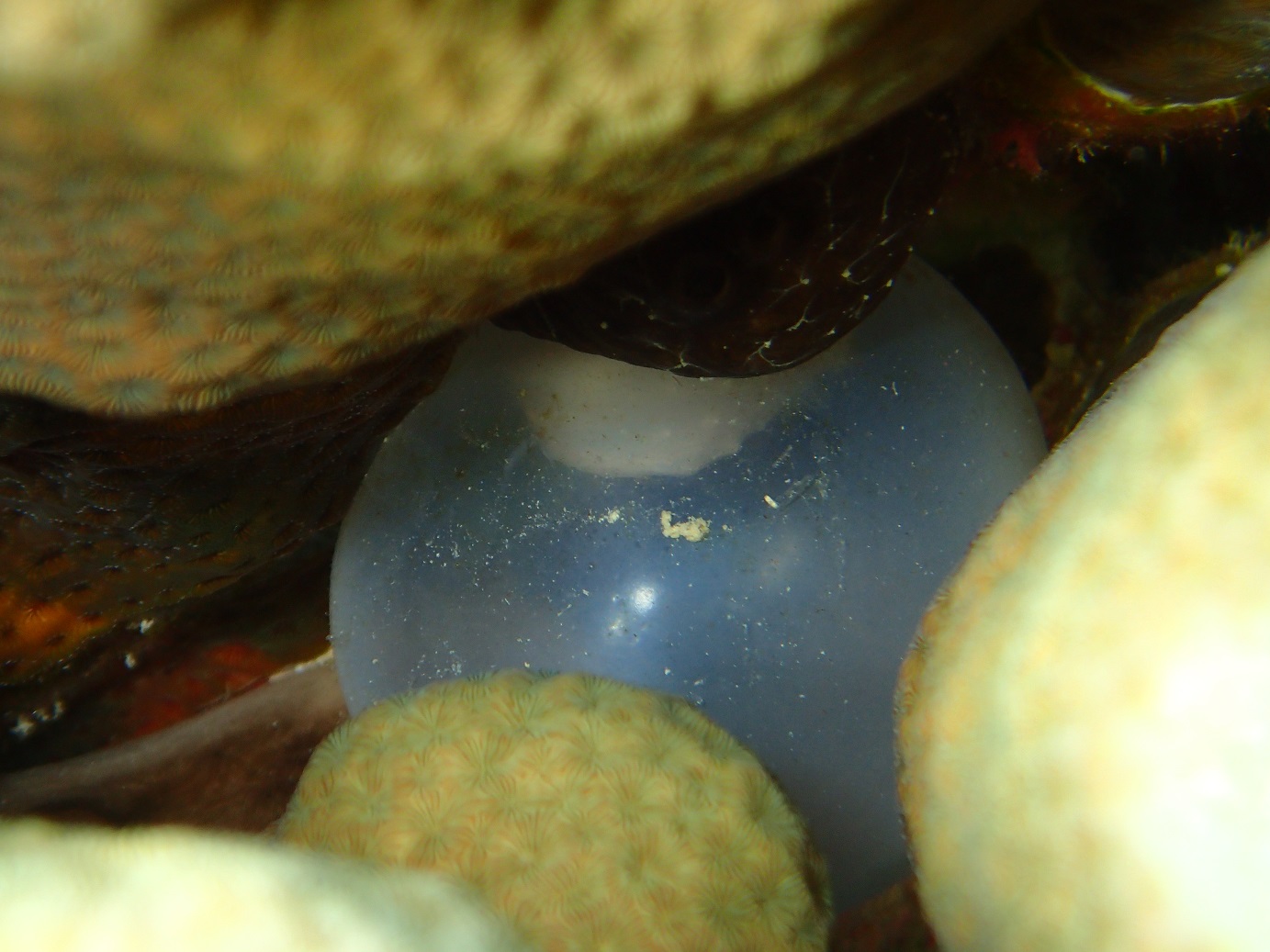 コモンシコロサンゴの中にコブシメが産んだ卵