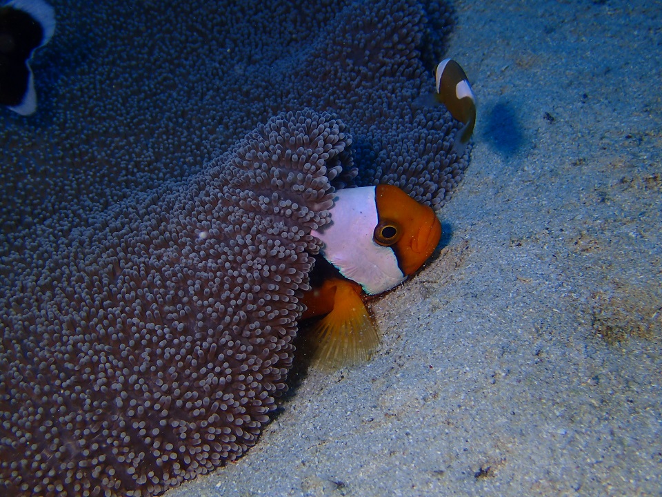 トウアカクマノミは周りが砂地の所にあるイソギンチャクに共生しており