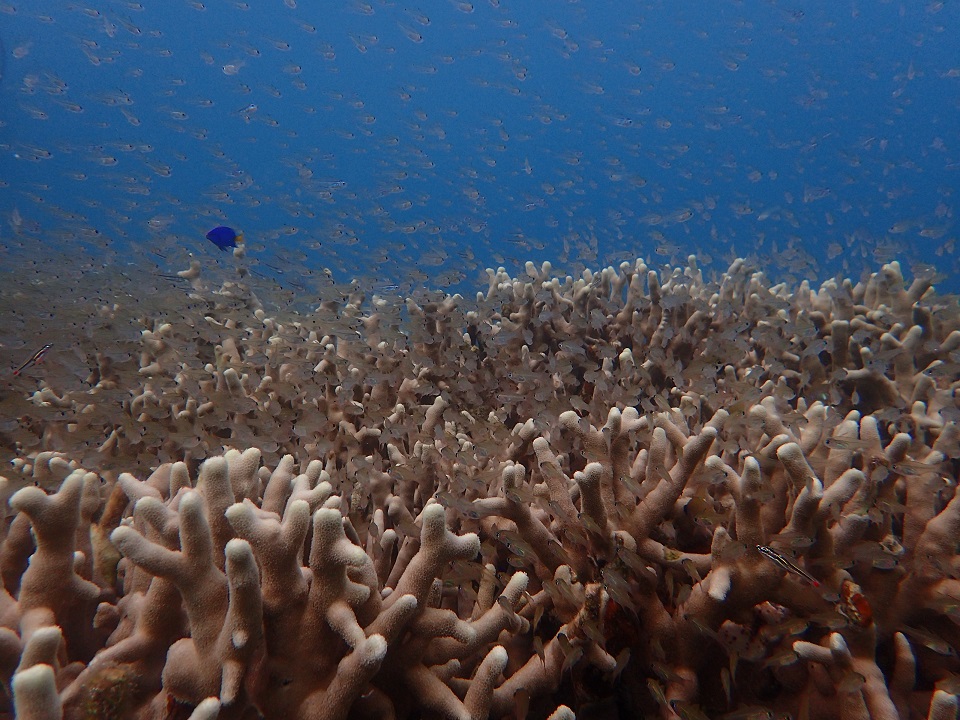 ユビエダハマサンゴの周りにはテンジクダイが群れ群れ