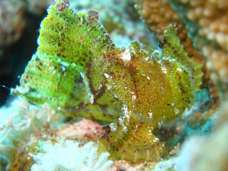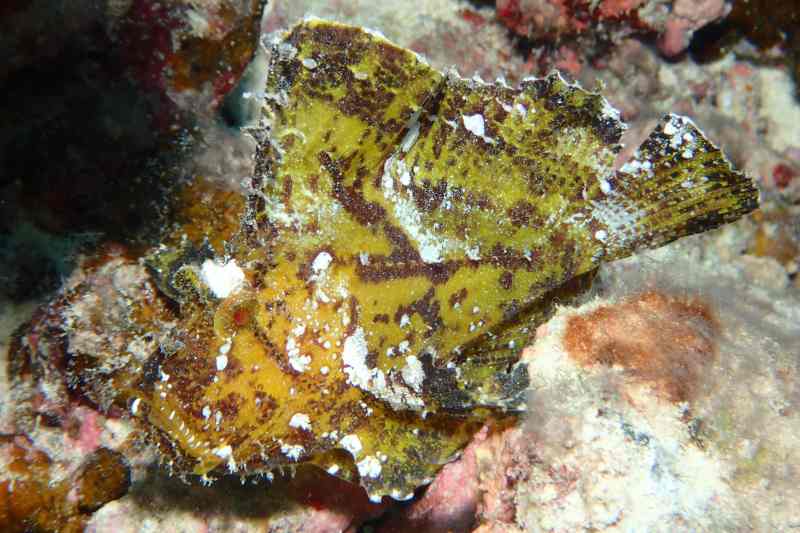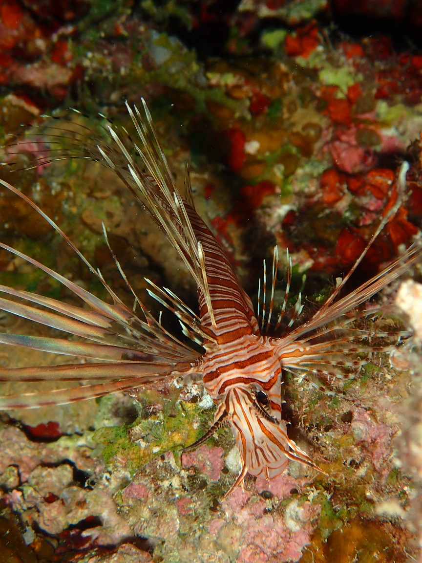 サンゴの近くでは、ネッタイミノカサゴが大きな口を開けてあくびをしていました。