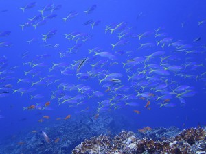 その上をロクセンスズメダイやオヤビッチャの群れが遊泳しています。