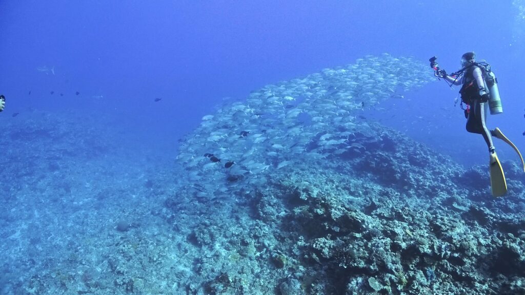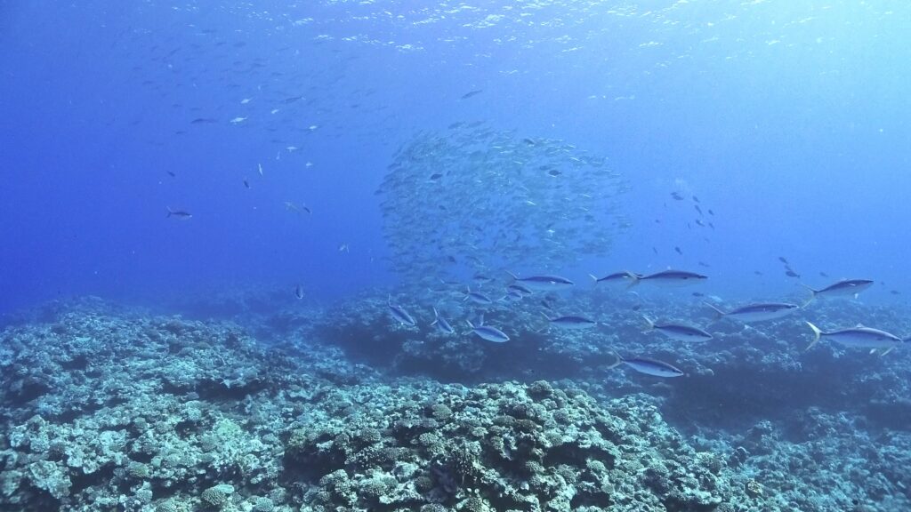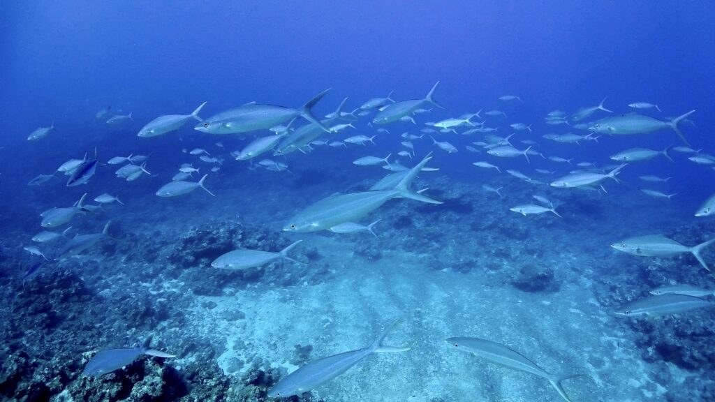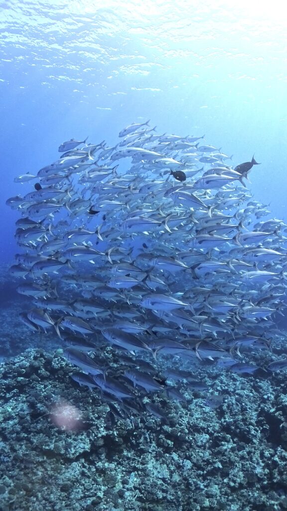 太陽の光を浴びたギンガメアジ