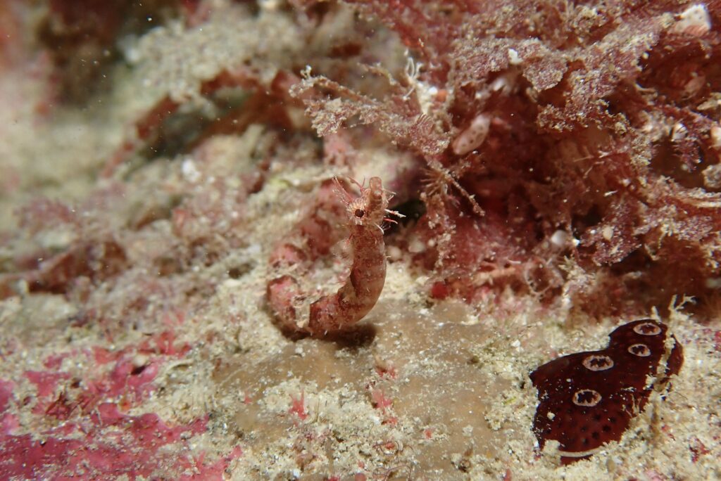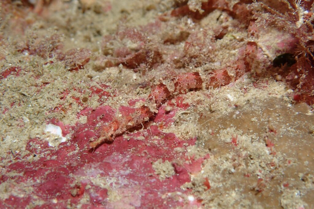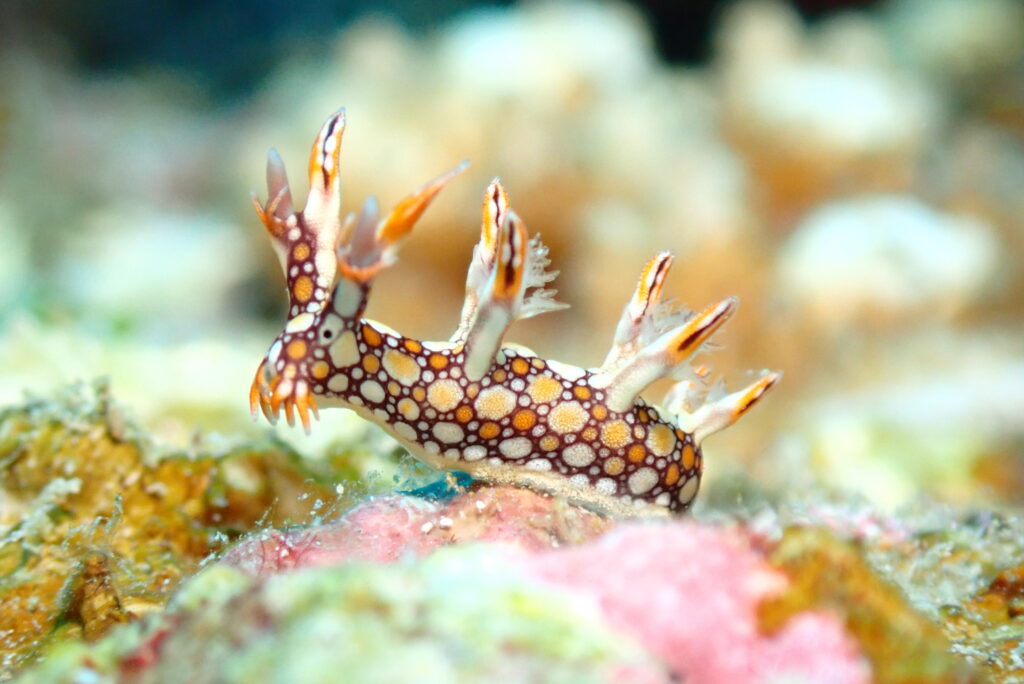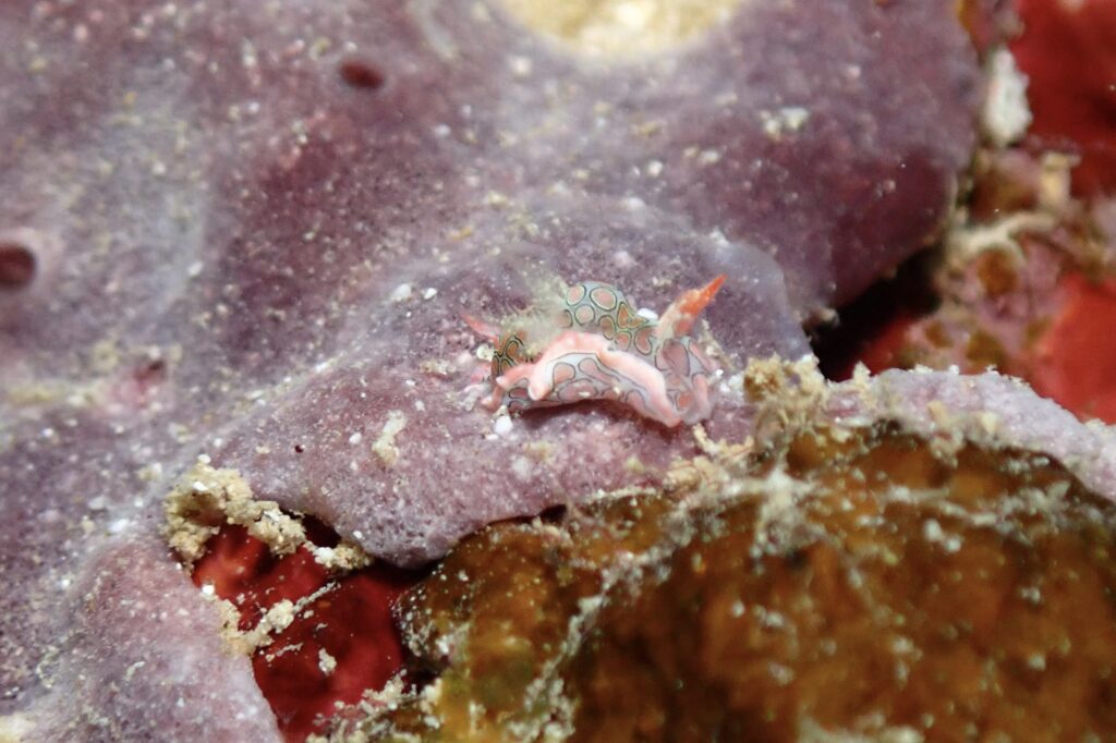 岩に付いてるカイメンを探すと、ピンク色のトウモンウミコチョウが