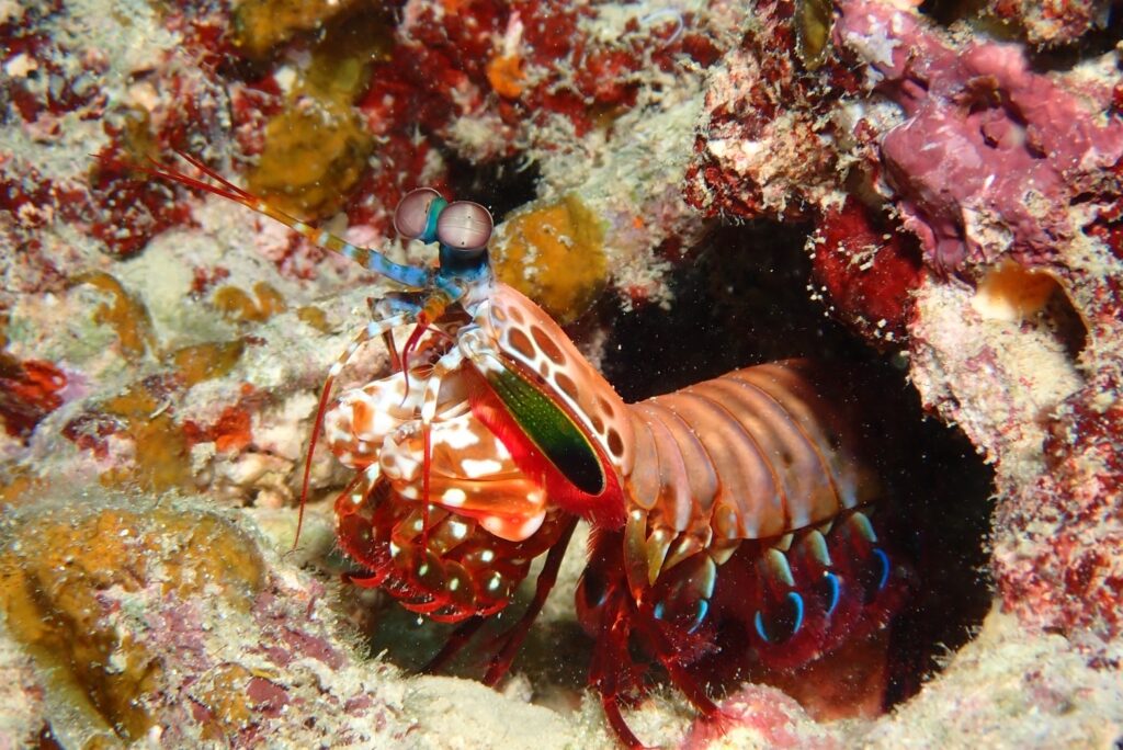 ド派手なモンハナシャコも身を乗り出してこんちわ〜