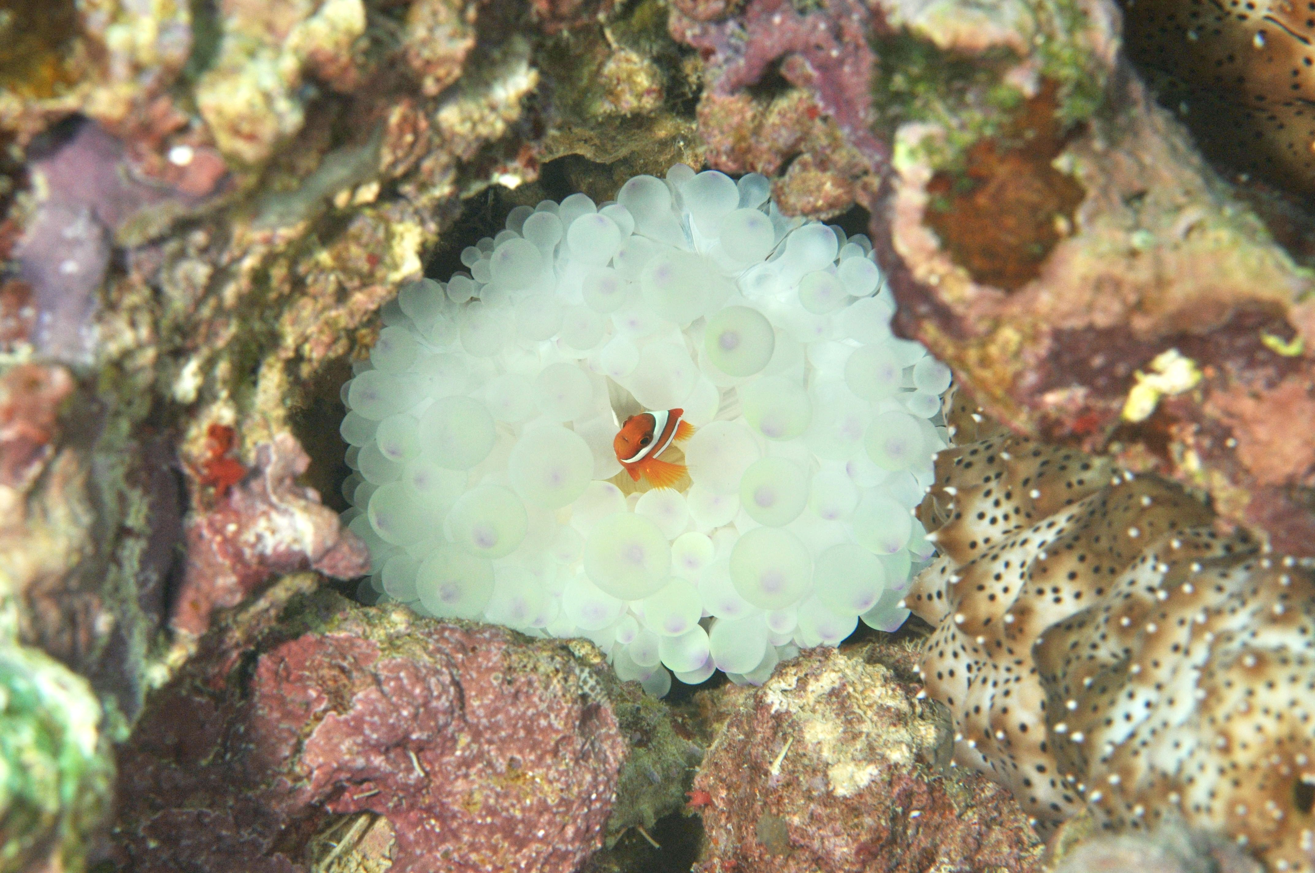 綺麗に白化したイソギンチャクに住む、2本線のハマクマノミBABY