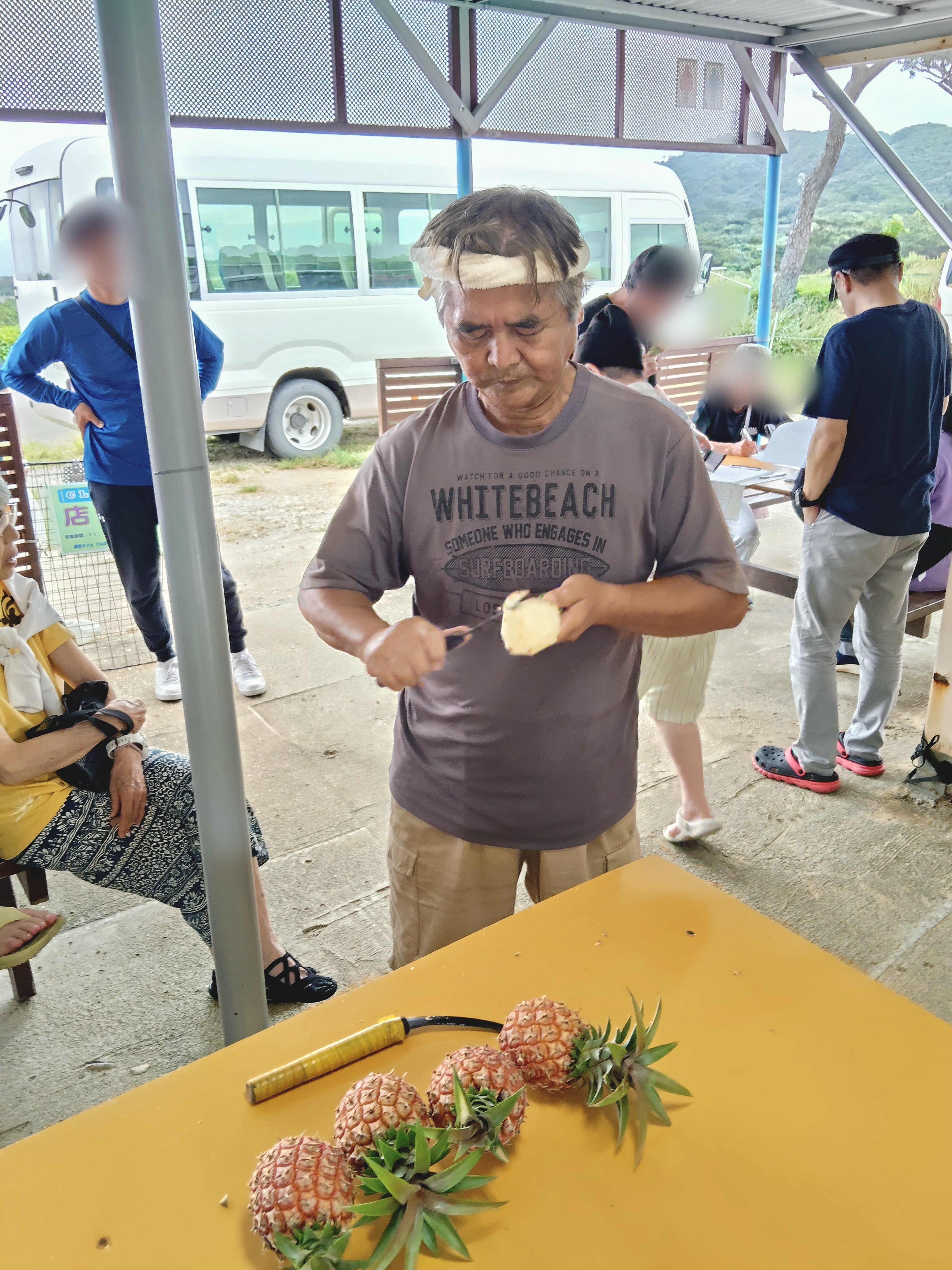 ワイルドにパイナップルをその場で剝いてくれて、みんなで丸かじり