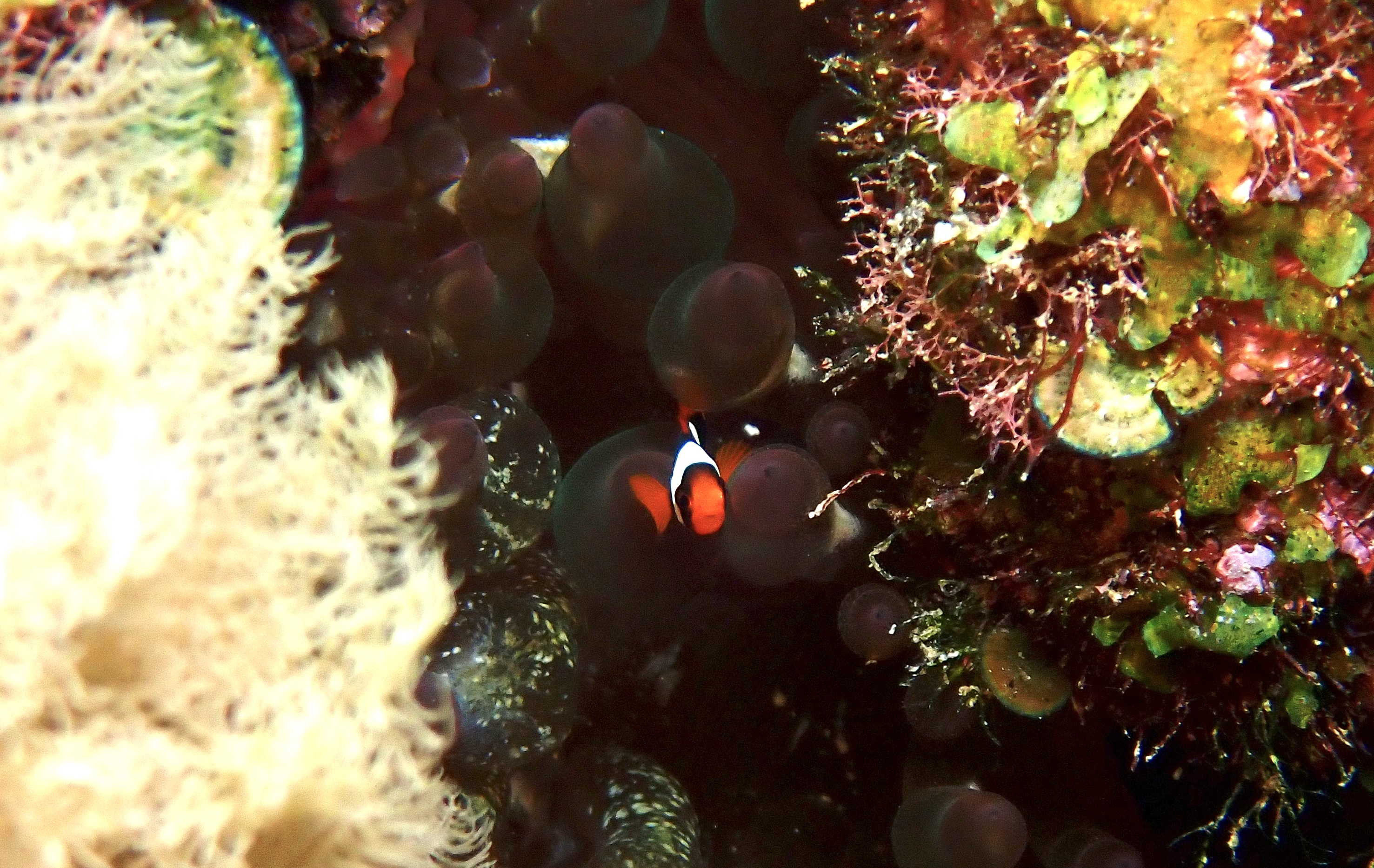 岩の隙間の小さなイソギンチャクにハマクマノミの子供が住んでました〜
