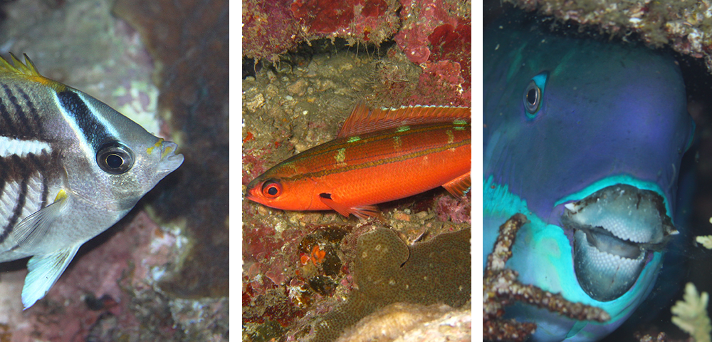 元気な夜行性のエビやカニといった甲殻類、その脇には寝ぼけた魚達の姿が…。
